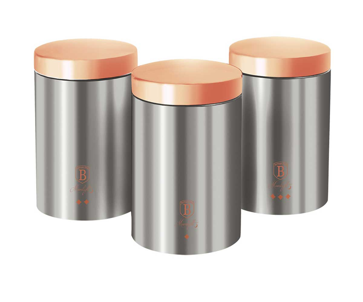 Sklop 3 posode za shranjevanje razsutih izdelkov, kot so kava, čaj, sladkor. Posode iz linije Moonligt Collection Berlinger Haus.Izdelano iz kovinsko lakiranega jekla.