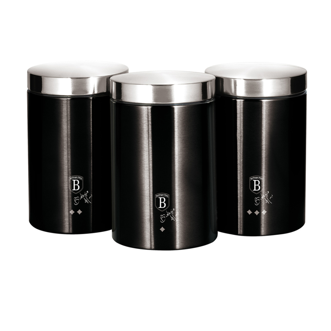 Sklop 3 posode za shranjevanje razsutih izdelkov, kot so kava, čaj, sladkor. Posode iz linije Black Silver Collection znamke Berlinger Haus.Iz črno lakiranega jekla.