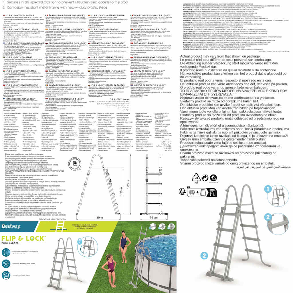 Varnostna lestev za bazen je primerna za prostostoječe bazene z maksimalno višino 122 cm. Lestev je enostavna za montažo. Opomba: Lestev za bazen je primerna za vodo z nevtralnim pH (ni primerna za morsko vodo).
