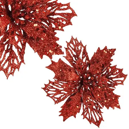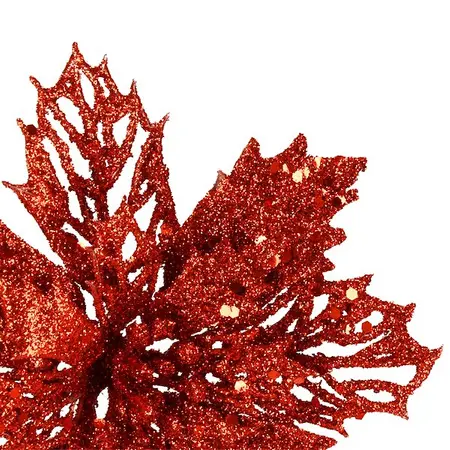 Božična zvezda, splošno znana kot božična zvezda, je eden od simbolov božiča. Čar te rože je predvsem v njenih lepih, olistanih cvetnih listih z značilnimi konicami. V naši ponudbi je velika, natančno izdelana roža v rdeči barvi, ki odlično posnema svojo živo dvojnico. Božična zvezda ni le lep okras sama po sebi, ampak tudi vpadljiv dodatek k aranžmajem ali doda piko na i videzu božičnega drevesca. Božična zvezda prekrita z bleščicami se čudovito sveti, zaradi česar je videti zelo elegantna. Omeniti velja tudi material, iz katerega so izdelani cvetni listi. Popolnoma posnema žamet, zaradi česar je cvet videti veliko bolj veličasten.