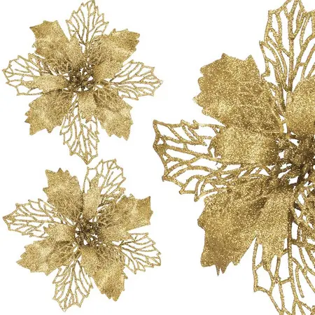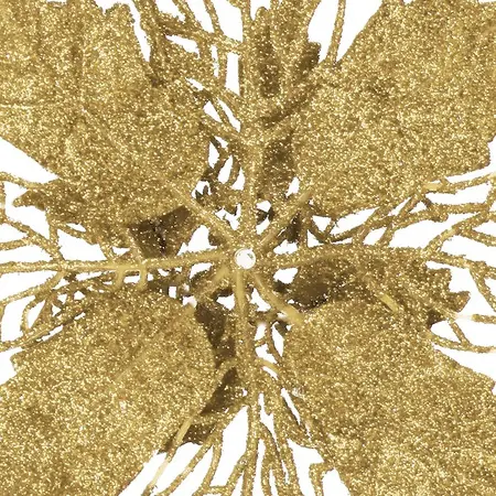 Božična zvezda, splošno znana kot božična zvezda, je eden od simbolov božiča. Čar te rože je predvsem v njenih lepih, olistanih cvetnih listih z značilnimi konicami. V naši ponudbi je velika, natančno izdelana roža zlate barve, ki odlično posnema svojo živo dvojnico. Božična zvezda ni le lep okras sama po sebi, ampak tudi vpadljiv dodatek k aranžmajem ali popestritev videza božičnega drevesca. Božična zvezda prekrita z bleščicami se čudovito lesketa in ji daje zelo eleganten videz. Omeniti velja tudi material, iz katerega so izdelani cvetni listi. Popolnoma posnema žamet, zaradi česar je cvet videti veliko bolj veličasten.