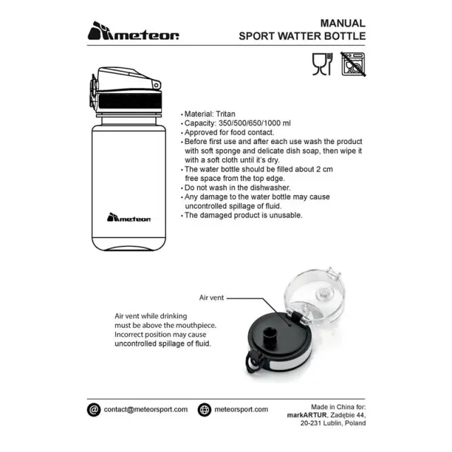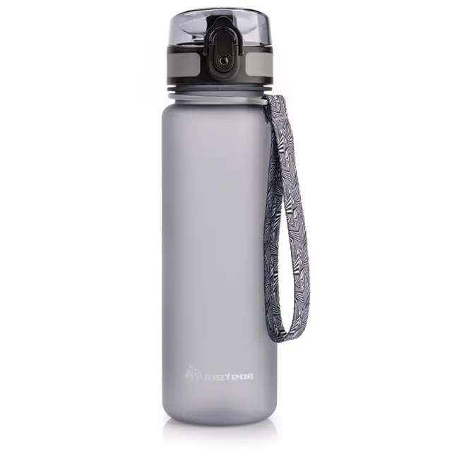 Praktični bidon znamke meteor, ki jo lahko vzamete s seboj na vadbo, fitnes ali kolesarski izlet, šolo ali kolesarjenje. Bidon je prozoren z mat zaključkom in nedrsečo površino. Ne omejuje pretoka pijače. Primeren je za tople in hladne napitke. Opremljen je z merilno skodelico in cedilom za ločevanje npr. sadja ali ledenih kock. Ima pravo velikost za večino nosilcev za avtomobile in kolesa. Je primerne velikosti za otroke. Bidon ima udoben trak za nošenje. Enostavno in hitro se odpre z enim samim gumbom. Zahvaljujoč posebni ključavnici pokrova vam ni treba skrbeti, da bi pijačo nenamerno polili.