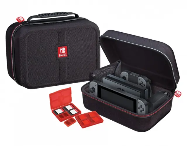 BIGBEN NINTENDO SWITCH DELUXE SYSTEM CASE zaščitna torbica je narejena iz trdnega materiala za maksimalno zaščito. V torbici lahko shranite konzolo s priloženimi krmilniki Joy-Con™. V oblazinjenemu predalu lahko shranite tudi stojalo za polnjenje, napajalnik, držalo Joy-Con ali krmilnik Pro Controller. Vključuje tudi 2 etuija za shranjevanje 4 igralnih kartic in 2 etuija za shranjevanje 2 kartic microSD. Mrežasta torbica je namenjena za shranjevanje kabla HDMI in dodatne opreme.