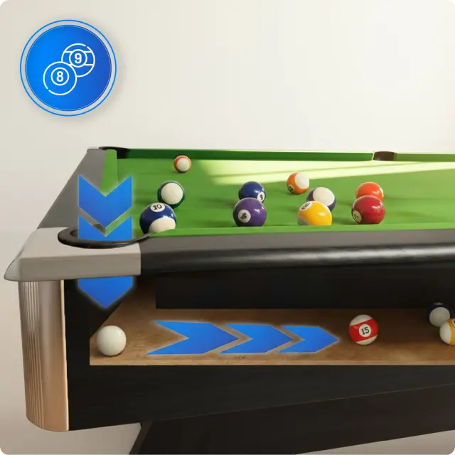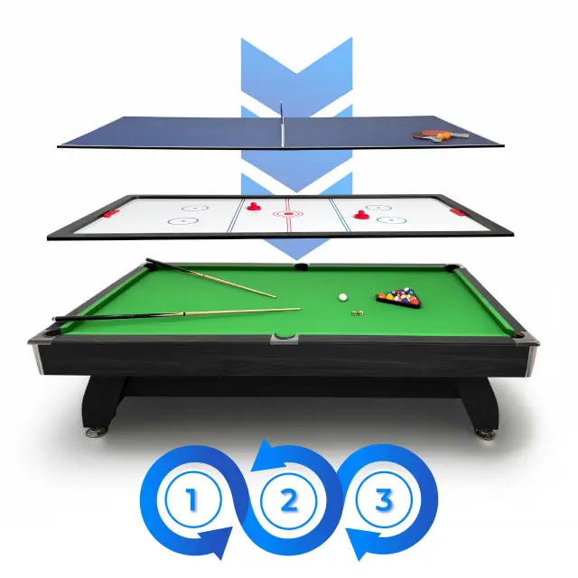 • Igralne površine se hitro menjujejo – 3-v-1 sistem (biljard / air hockey / namizni tenis)