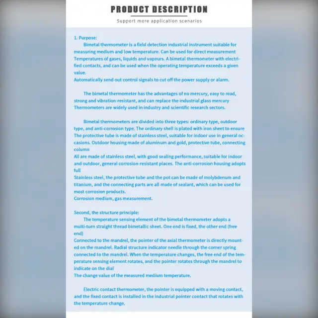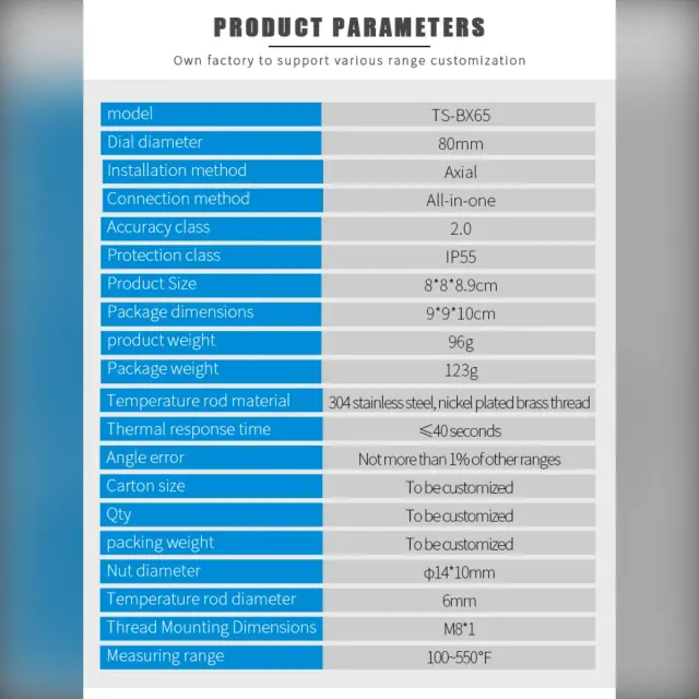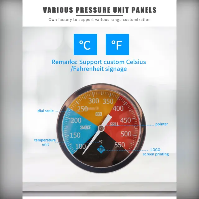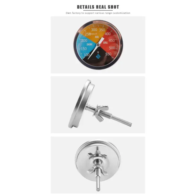 Mehanična natančnost: Ta bimetalni termometer uporablja fizično bimetalno ploščico, ki temperaturo pretvori v natančen mehanski premik, kar zagotavlja zanesljive meritve brez baterij ali napajanja. Nerjaveče jeklo in analogna skala ohranjata ponovljivost rezultatov v scenarijih dimljenja in visoke temperature, kar uporabniku omogoča dosledno kontrolo pečenja in priprave jedi, ne glede na to, ali gre za domačo kuhinjo ali bolj zahtevno industrijsko okolje.