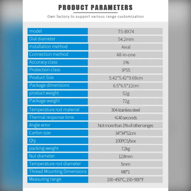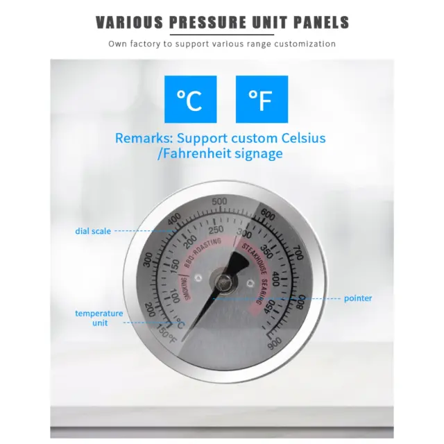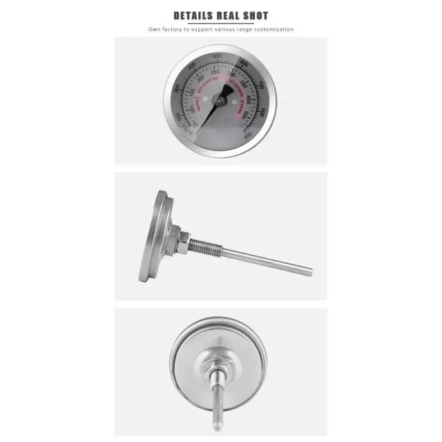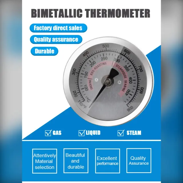 Natančno branje: Ta bimetalni termometer uporablja bimetalno trakovo mehaniko, ki se fizično deformira glede na toploto in zagotavlja jasne, zanesljive temperature brez elektronskih virov napak. V kuhinjskih in industrijskih scenarijih, kot so žar, dimljenje, pečice ali kotli, omogoča intuitivno odčitavanje, kar uporabniku pomaga prepoznati optimalne temperature za različne sestavine in postopke kuhanja ter pri tem ohranja tehnično enako merilno načelo kot izvorni opis.