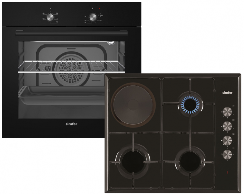 Vgradni kuhinjski set Simfer BIOH 31B5B je sestavljen iz prostorne ventilatorske vgradne pečice in črne kombinirane kuhalne plošče. Pečica se ponaša s 56 litrsko prostornino, petimi programi peke, mrežno rešetko in pladnjem za peko. Kombinirana kuhalna plošča s tremi plinskimi gorilniki prirejenimi za jeklenko ali zemeljski plin, enim električnim kuhališčem ter emajliranimi nosilci posode zadovolji še tako zahtevnega uporabnika.