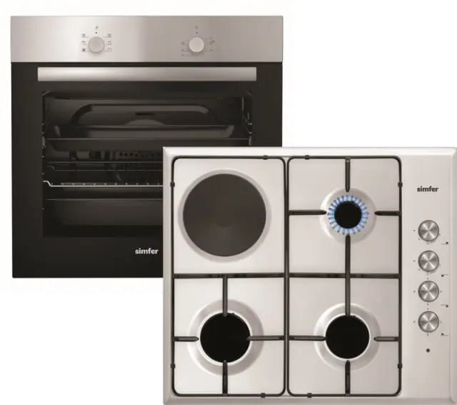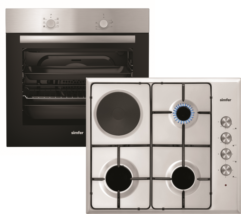 Vgradni kuhinjski set Simfer BIOH31X5X je sestavljen iz vgradne pečice B6ES006SGI in vgradne kombinirane kuhalne plošče 6310 VERIM. Pečica se pohvali z 60 litrsko prostornino in ventilacijsko peko. Odlikuje jo 5 programov peke, upravljanje z gumbi, 90 minutni časovnik, dvojna steklena vrata, in razpon temperature od 40°do 240°C s pomočjo katere bo peka postala pravi užitek. Možnost preprostega čiščenja, osvetlitev pečice, 1 pekač in 1 mrežna rešetka omogočajo udobno in varno peko. Pečico dopolnjuje vgradna kombinirana kuhalna plošča Simfer 6310 VERIM, ki se ponaša s 3 plinskimi in 1 električnim kuhališčem, dimenzije 14,5 cm. Emajlirani nosilci posode, sprednje upravljanje, elektronski vžig plina in varnostni ventili poskrbijo za udobno in varno pripravo vaših najljubših jedi. Plinske kuhalne površine so primerne za kuhanje s pomočjo zemeljskega plina ali jeklenke. Serijsko so nameščene šobe za jeklenko, za zemeljski plin pa so priložene.