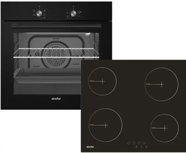 Vgradni kuhinjski set Simfer BIOH 40B5B je sestavljen iz prostorne ventilatorske vgradne pečice in steklokeramične kuhalne plošče s štirimi kuhališči. Pečica se ponaša s 56 litrsko prostornino, petimi programi peke, mrežno rešetko in pladnjem za peko. Štiri Hi-light kuhalne površine premera 2x 14 cm (1,2 kW) in 2x 18/12 cm (1,7 kW/0,7 kW) z upravljanjem na dotik, prikazom preostanka toplote in prikazovalnikom vklopa ter izklopa poskrbijo za preprosto, hitro in učinkovito pripravo vaših najljubših jedi.