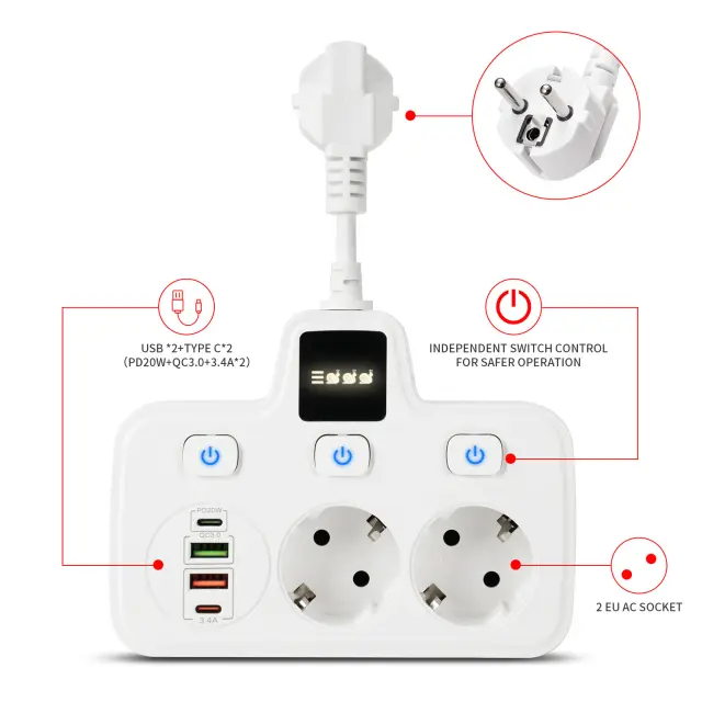 Tehnologija hitrega polnjenja: Ta podaljšek je opremljen z napredno tehnologijo hitrega polnjenja in optimizira hitrost polnjenja vaših naprav. Prepozna priključene naprave in dovaja ustrezen tok, kar zagotavlja varno in učinkovito polnjenje.