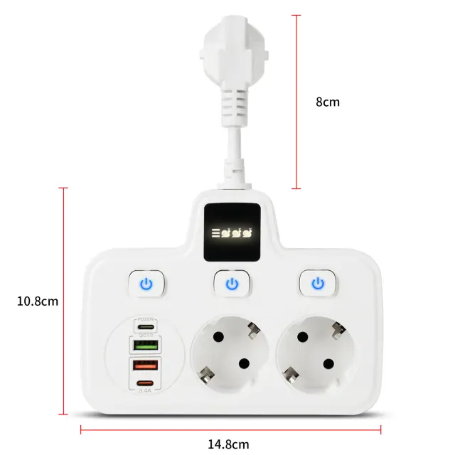 Prostorsko varčna zasnova: Kompaktna in elegantna zasnova tega podaljška je prilagojena sodobnim bivalnim prostorom. Njegova nekrogla oblika in optimalne dimenzije (14,8 cm x 10,8 cm x 3 cm) omogočajo priročno postavitev na mize, nočne omarice ali v kovčke, ne da bi zavzel nepotreben prostor.