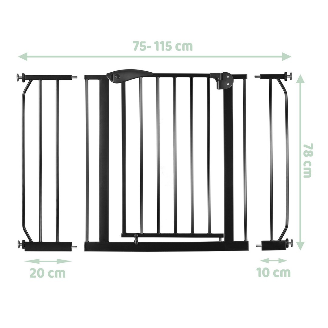 Ensure your child's safety with the Black Steel Nukido 718300 Child Safety Gate. This safety gate features a no-drill installation, protecting your walls from damage. Made from durable black steel, it fits openings from 75 to 115 cm, making it perfect for various doorways. Ideal for preventing accidents, this gate keeps your little one safe from stairs. With a user-friendly design for one-handed operation, it can be easily dismantled when not in use. Enjoy peace of mind with the Nukido Safety Gate, certified to EN1930:2011 standards.