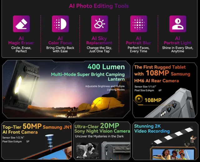 Vgrajena 400-lumnov (“400 lm”) kamp luč na zadnji strani – to je prava svetilka, ne le bliskavica kamere.