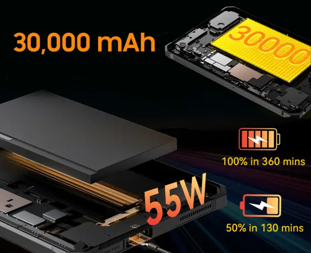Tab Active 10 Pro vam s pomočjo 30000 mAh baterije omogoča, da jo uporabljate več dni skupaj, opravljate video klice, poslušate glasbo, igrate igrice ali brskate po spletu. Tablica podpira tudi najnovejše 55W hitro polnjenje!