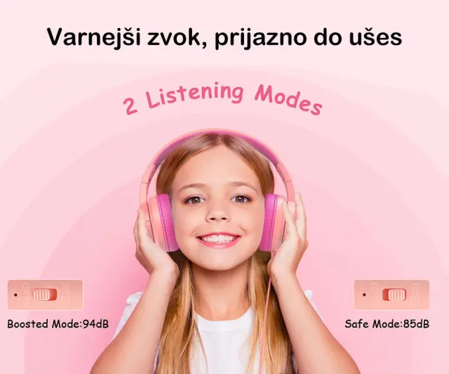 Z gumbom za nastavljivo glasnost lahko otroci preklapljajo med varnim načinom 85 dB in okrepljenim načinom 94 dB.