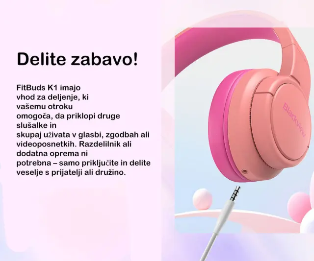 Slušalke ustvarjajo zabavno in poglobljeno zvočno izkušnjo, ki je idealna za poslušanje glasbe, pravljic, izobraževalnih vsebin ali igranje iger – kadar koli in kjer koli. Otroci se tako lažje potopijo v svet zvoka, starši pa so lahko mirni glede kakovosti in udobja poslušanja.