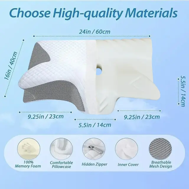 Ergonomska oblika metulja: Edinstvena oblika metulja te blazine zagotavlja odlično podporo vaši glavi, vratu in ramenih, spodbuja pravilno poravnavo hrbtenice in zmanjšuje bolečine v vratu. Njegova ergonomska oblika pomaga razbremeniti točke pritiska in zagotavlja udobno izkušnjo spanja.