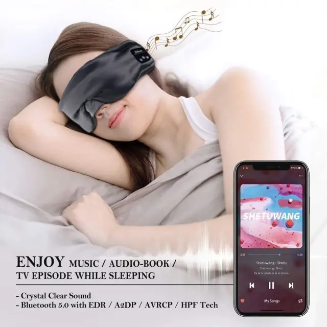 Ta spalna maska je opremljena s tehnologijo Bluetooth in ima stabilen in gladek prenos pri visoki hitrosti. Njegov vgrajen nastavljiv zvočnik in prostoročni mikrofon prav tako zagotavljata jasne klice. Zasnovana iz materiala, ki dobro diha, zaradi česar je spalna maska zelo udobna za nošenje.