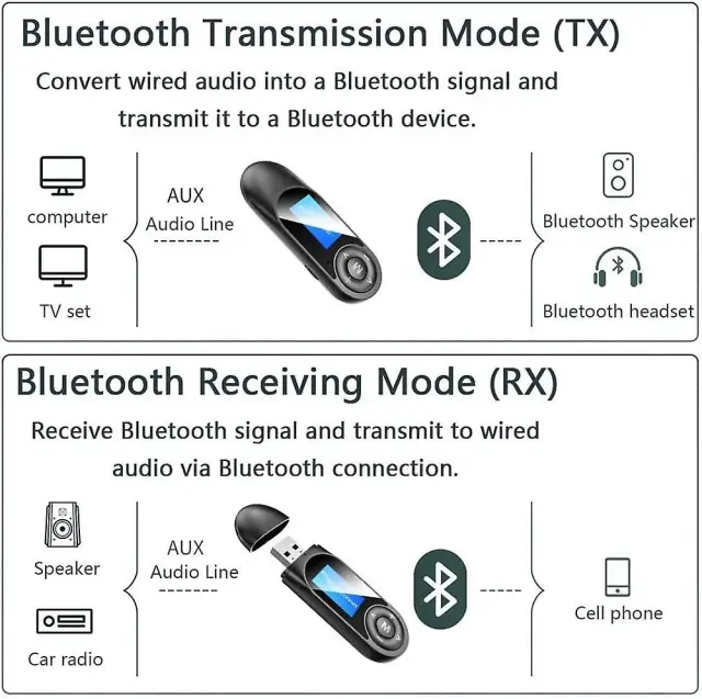 Bluetooth 5.0: Po namestitvi čipa Bluetooth 5.0 ima adapter USB Bluetooth boljše delovanje kot prejšnja različica v smislu daljše razdalje prenosa, hitrejše hitrosti prenosa podatkov in manjše porabe energije. Sprejemnik oddajnika 2-v-1: Način prenosa Bluetooth (TX): Pretvorite žični zvok v signal Bluetooth in oddajte v izhod naprave Bluetooth.