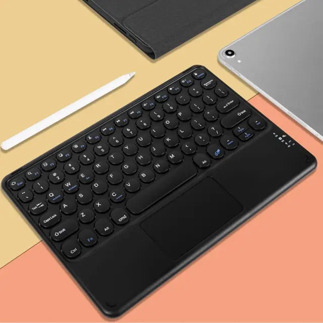 Integriran nadzor sledilne ploščice: Ta Bluetooth tipkovnica je opremljena z integrirano sledilno ploščico, ki ponuja natančen in intuitiven nadzor kurzorja. Sledilna ploščica podpira poteze z več prsti, kar vam omogoča enostavno krmarjenje po spletnih straneh, pomikanje po dokumentih in enostavno izvajanje drugih opravil. Sledilna ploščica odpravlja potrebo po ločeni miški, zaradi česar je idealna za uporabo v tesnih prostorih ali na poti. Gladka površina sledilne ploščice zagotavlja natančno sledenje in odzivnost, kar zagotavlja brezhibno uporabniško izkušnjo. Ne glede na to, ali urejate fotografije, ustvarjate predstavitve ali preprosto brskate po spletu, bo integrirana sledilna ploščica izboljšala vašo produktivnost in udobje.