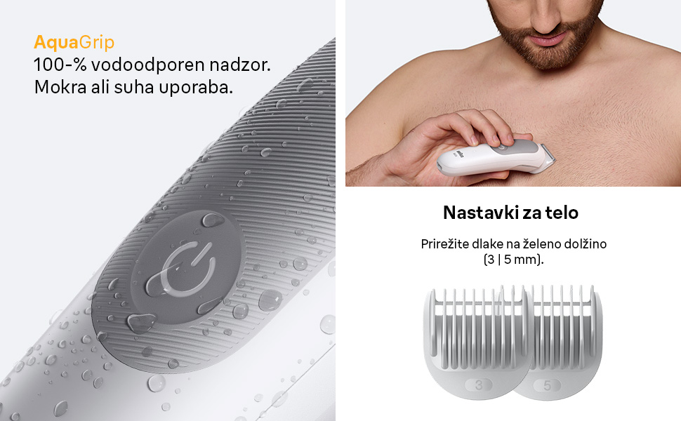 Zasnovan, da traja: 100-odstotno vodoodporen z oprijemom AquaGrip, ki omogoča nadzor celo pod prho. Opremljen z močno Li-ion baterijo, ki omogoča 100 minut delovanja