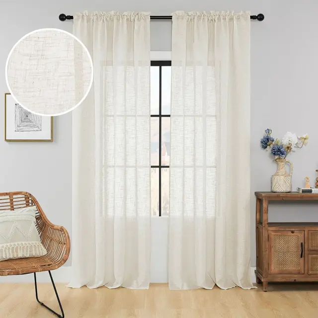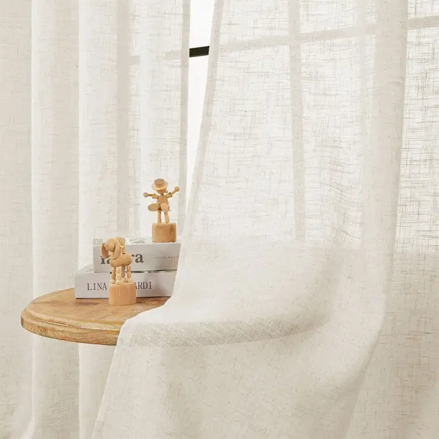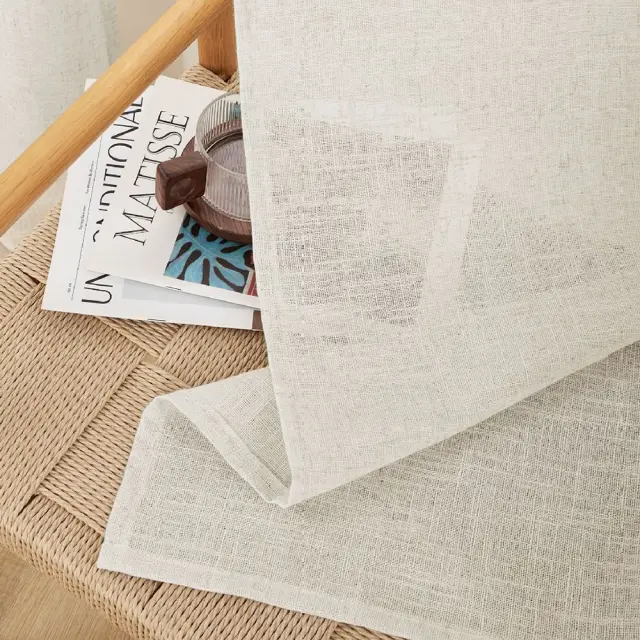 Mehko filtriranje svetlobe: Te polprosojne zavese z videzom lanu nežno filtrirajo svetlobo, hkrati pa povečujejo zasebnost. Tkana tekstura doda pridih naravne elegance vsakemu prostoru in ustvarja toplo in prijetno vzdušje. Popolne so za dnevne sobe, spalnice ali kateri koli prostor, kjer želite omehčati svetlobo in dodati pridih sloga. Te zavese omogočajo, da sončna svetloba prodre v prostor, hkrati pa zagotavljajo določeno stopnjo zasebnosti, zaradi česar so idealne za ustvarjanje udobnega in sproščujočega okolja. Uživajte v lepoti naravne svetlobe, ne da bi žrtvovali svojo zasebnost s temi vsestranskimi in elegantnimi zavesami. Primerne so za različne velikosti oken in sloge dekorja.