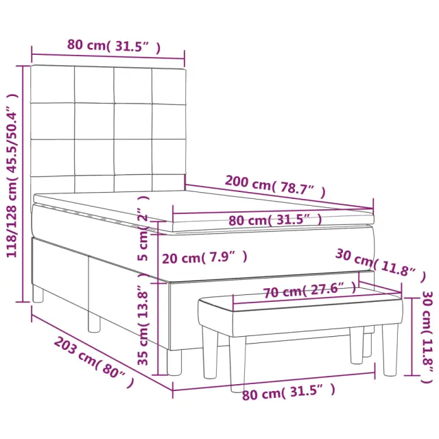 Uporabite to box spring posteljo za uživanje v mirnem spancu! Ponuja maksimalno sprostitev in prijeten spanec. Trpežno blago: Blago zagotavlja preprost in čist videz, poleg tega pa je zračno in trpežno.Praktično vzglavje: Vzglavje postelje je nastavljivo po višini po vaših željah. To vzglavje za posteljo vam zagotavlja odlično oporo za hrbet, ko sedite na postelji in berete ali gledate filme.Ležišče z žepkastimi vzmetmi: Vgrajena individualna žepkasta vzmet je znana po zelo visoki kakovosti, hkrati pa zagotavlja visoko stopnjo vzdržljivosti in prilagodljivosti. Lahko učinkovito absorbira hrup in udarce, ki jih povzročata metanje in obračanje.Srednje trda opora: Posteljna vzmetnica odlično zagotavlja dodatno stabilnost in ravno pravšnjo stopnjo čvrstosti, ne da bi pri tem žrtvovala udobje. Zato je idealna za tiste, ki spijo na hrbtu ali trebuhu.Koži prijazen nadvložek: Zaščita za ležišče ima trpežno in koži prijazno tkanino, zaradi česar je mehka in udobna.Večnamenska klop: Ta klop lahko služi kot dodaten sedež v vašem domu. Lahko se uporablja tudi kot zaključek posteljne klopi. Opomba:Zaradi higienskih razlogov vzmetnice ni mogoče vrniti po odstranitvi ali odprtju embalaže.Vsakemu izdelku je priložen priročnik za enostavno sestavljanje.Postelja:Barva: ČrnaMaterial: Blago (100 % poliester), vezan les, konstruiran lesDimenzije: 203 x 80 x 118/128 cm (D x Š x V)Vzmetnica za posteljo:Barva: Črna in belaMaterial: Blago (100 % poliester)Material polnila: Žepkaste vzmeti, penaDimenzije: 80 x 200 x 20 cm (Š x D x V)Nadvložek:Barva: BelaMaterial: Blago (100 % poliester)Material polnila: PenaDimenzije: 80 x 200 x 5 cm (Š x D x V)Klop:Barva: ČrnaMaterial: Blago (100 % poliester), vezan les, konstruiran lesDimenzije: 70 x 30 x 30 cm (Š x G x V)Paket vsebuje:1 x Posteljni okvir1 x Vzglavje1 x Vzmetnica1 x Nadvložek1 x Klop