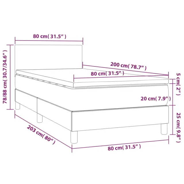 Uporabite to box spring posteljo za uživanje v mirnem spancu! Ponuja maksimalno sprostitev in prijeten spanec. Trpežno blago: Blago zagotavlja preprost in čist videz, poleg tega pa je zračno in trpežno.Praktično vzglavje: Vzglavje postelje je nastavljivo po višini po vaših željah. To vzglavje za posteljo vam zagotavlja odlično oporo za hrbet, ko sedite na postelji in berete ali gledate filme.Ležišče z žepkastimi vzmetmi: Vgrajena individualna žepkasta vzmet je znana po zelo visoki kakovosti, hkrati pa zagotavlja visoko stopnjo vzdržljivosti in prilagodljivosti. Lahko učinkovito absorbira hrup in udarce, ki jih povzročata metanje in obračanje.Srednje trda opora: Posteljna vzmetnica odlično zagotavlja dodatno stabilnost in ravno pravšnjo stopnjo čvrstosti, ne da bi pri tem žrtvovala udobje. Zato je idealna za tiste, ki spijo na hrbtu ali trebuhu.Koži prijazen nadvložek: Zaščita za ležišče ima trpežno in koži prijazno tkanino, zaradi česar je mehka in udobna. Opomba:Zaradi higienskih razlogov vzmetnice ni mogoče vrniti po odstranitvi ali odprtju embalaže.Vsakemu izdelku je priložen priročnik za enostavno sestavljanje.Postelja:Barva: Temno rjavaMaterial: Blago (100 % poliester), vezan les, konstruiran lesDimenzije: 203 x 80 x 78/88 cm (D x Š x V)Vzmetnica za posteljo:Barva: Bela in temno rjavaMaterial: Blago (100 % poliester)Material polnila: Žepkaste vzmeti, penaDimenzije: 80 x 200 x 20 cm (Š x D x V)Nadvložek:Barva: BelaMaterial nadvložka: Blago (100 % poliester)Material polnila: PenaDimenzije: 80 x 200 x 5 cm (Š x D x V)Paket vsebuje:1 x Posteljni okvir1 x Vzglavje1 x Vzmetnica1 x Nadvložek