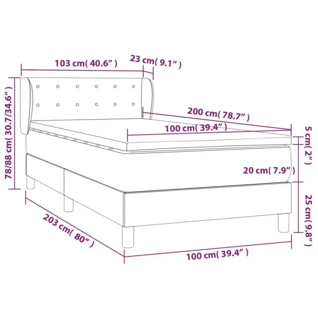 Uporabite to box spring posteljo za uživanje v mirnem spancu! Ponuja maksimalno sprostitev in prijeten spanec. Trpežno blago: Blago zagotavlja preprost in čist videz, poleg tega pa je zračno in trpežno.Praktično vzglavje: Vzglavje postelje je nastavljivo po višini po vaših željah. To vzglavje za posteljo vam zagotavlja odlično oporo za hrbet, ko sedite na postelji in berete ali gledate filme.Ležišče z žepkastimi vzmetmi: Vgrajena individualna žepkasta vzmet je znana po zelo visoki kakovosti, hkrati pa zagotavlja visoko stopnjo vzdržljivosti in prilagodljivosti. Lahko učinkovito absorbira hrup in udarce, ki jih povzročata metanje in obračanje.Srednje trda opora: Posteljna vzmetnica odlično zagotavlja dodatno stabilnost in ravno pravšnjo stopnjo čvrstosti, ne da bi pri tem žrtvovala udobje. Zato je idealna za tiste, ki spijo na hrbtu ali trebuhu.Koži prijazen nadvložek: Zaščita za ležišče ima trpežno in koži prijazno tkanino, zaradi česar je mehka in udobna. Opomba:Zaradi higienskih razlogov vzmetnice ni mogoče vrniti po odstranitvi ali odprtju embalaže.Vsakemu izdelku je priložen priročnik za enostavno sestavljanje.Postelja:Barva: Temno rjavaMaterial: Blago (100 % poliester), trden macesnov les, vezan les, inženirski lesDimenzije: 203 x 103 x 78/88 cm (D x Š x V)Vzmetnica za posteljo:Barva: Bela in temno rjavaMaterial: Blago (100 % poliester)Material polnila: Žepkaste vzmeti, penaDimenzije: 100 x 200 x 20 cm (Š x D x V)Nadvložek:Barva: BelaMaterial nadvložka: Blago (100 % poliester)Material polnila: PenaDimenzije: 100 x 200 x 5 cm (Š x D x V)Paket vsebuje:1 x Posteljni okvir1 x Vzglavje z ušesi1 x Vzmetnica1 x Nadvložek