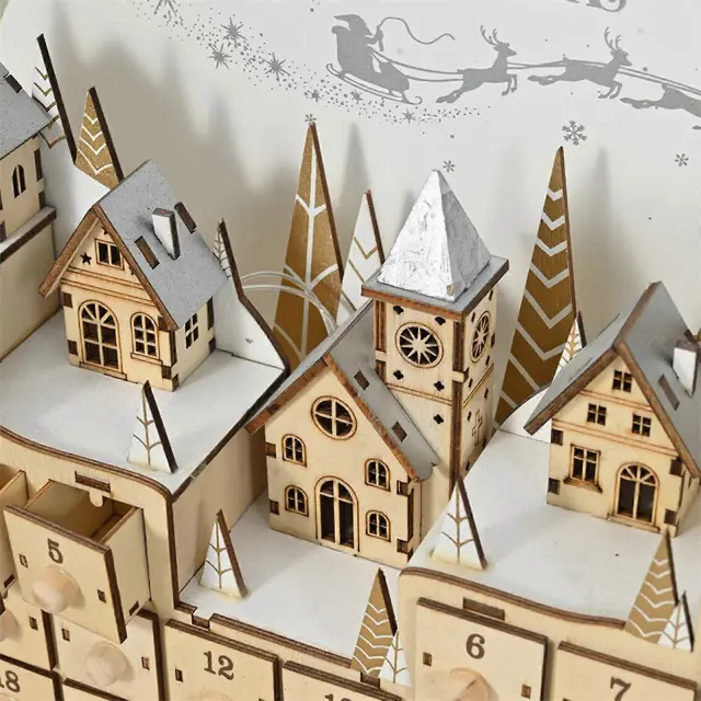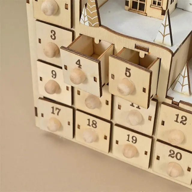 Božične hiške Adventni koledar Eleganten leseni koledar z LED osvetljenimi odštevalniki do božiča s 24 predali za darila