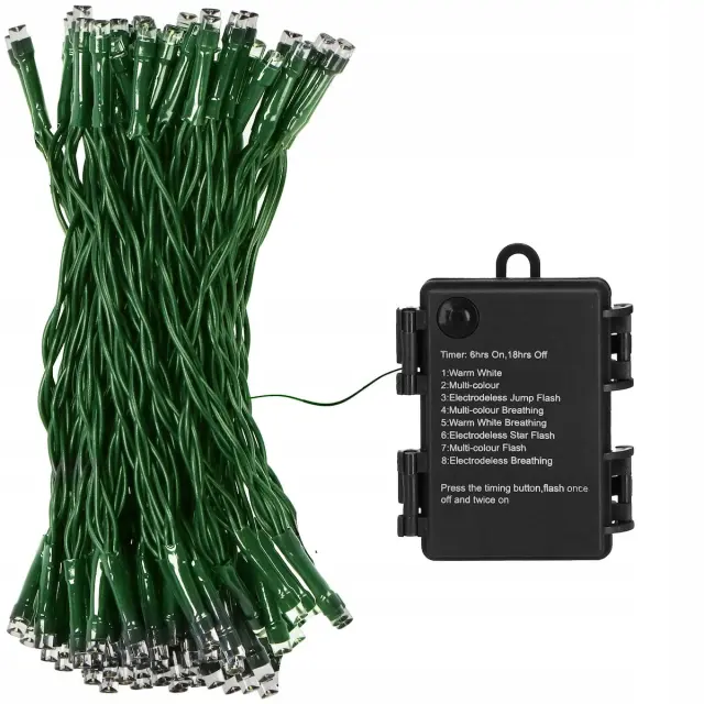 Luči in svetleči okraski Springos® so sinonim za kakovost, tako zaradi svojega videza kot zaradi skrbnosti, s katero so izdelani. Energetska učinkovitost, najboljši materiali, varnost pri uporabi, certifikati in podrobne specifikacije: na to se lahko zanesete, ko izberete naše izdelke. PARAMETRI: Barva osvetlitve: večbarvna + topla bela Število LED diod: 50 enot Razred vodotesnosti IP44 Barva kablov / napajanje: zeleni kabli, črna Uporaba napajanja: zunanje in notranje napajanje: baterija - 3x AA (ni priložena) - 1,5 V časovnik - 6 h vklopljen in nato izklopljen za 18 h Gorenje diode ne ugasne celotne napetosti 4,5 V CE certifikat Napajalna omarica ima kljukico - lahko obešanje Mere: Dolžina svetlečega dela 5 m Pribl. napajalnega kabla: 30 cm Baterijska omarica: 8 x 6,5 cm Razdalja med LED diodami: vsakih 9,5 cm 8-funkcijski programator: Enakomerna topla bela Večbarvno trajno utripanje s postopno pospešenim polmesecem - večbarvno in toplo bela Zatemnitev in izstopanje - topla bela Zatemnitev in izstopanje - večbarvno Močno utripanje - večbarvno in toplo belo Utripanje - belo in toplo belo Preklop - toplo belo in večbarvno Koda izdelka: CL4107