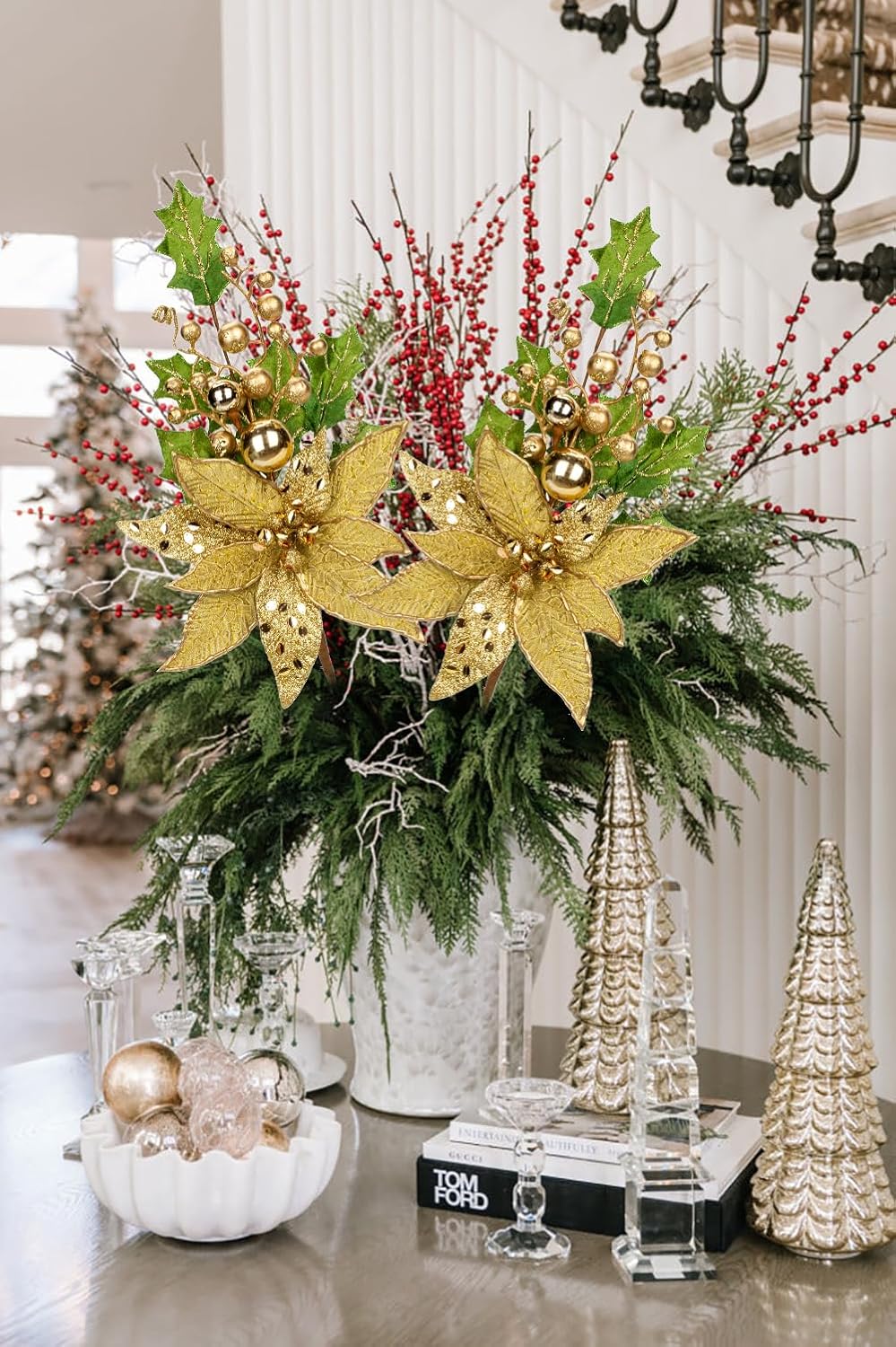 Komplet okrasnih cvetov Oirse je stilski in praktičen dodatek, ki s svojo zlato barvo in bleščečim zaključkom zagotavlja poseben čar v vsakem okolju. Trpežni materiali omogočajo dolgotrajno uporabo in ohranjanje oblike v različnih aranžmajih, od božičnega drevesca do dekoracije praznične mize. Izberite ta komplet za popoln sijaj v svojem domu in naročite svoj par okrasnih cvetov še danes.