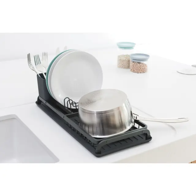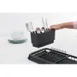 Brabantia odcejevalnik za posodo je odlična rešitev za vse, ki vam primanjkuje prostoa. Ima žični okvir iz nerjevečih materialov in je opremljen s snemljivim držalom za jedilni pribor.