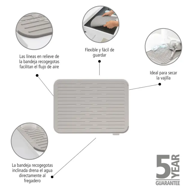 Narejena iz mehkega, nedrsečega silikona - primerna za posodo, skodelice in celo krhko steklovino. Voda iz posod teče neposredno v umivalnik - vaša delovna plošča ostane suha.Prednosti in lastnosti Idealno za vsa mala opravila pri pomivanju posode. Izdelana iz trpežnega silikona - enostavna za čiščenje in enostavno pranje v pomivalnem stroju varna. 5-letna garancija in servis.
