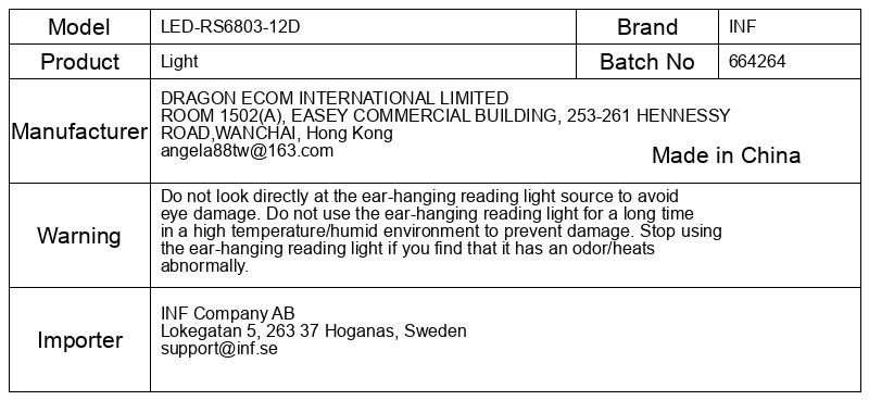 Ne glejte neposredno v vir bralne lučke za ušesa, da preprečite poškodbe oči. Bralne lučke za ušesa ne uporabljajte dlje časa v okolju z visoko temperaturo/vlažnostjo, da preprečite poškodbe. Prenehajte uporabljati bralno lučko za ušesa, če opazite, da ima neprijeten vonj/se nenormalno segreva.