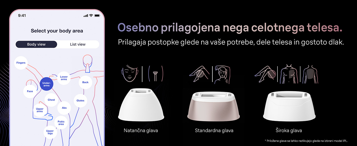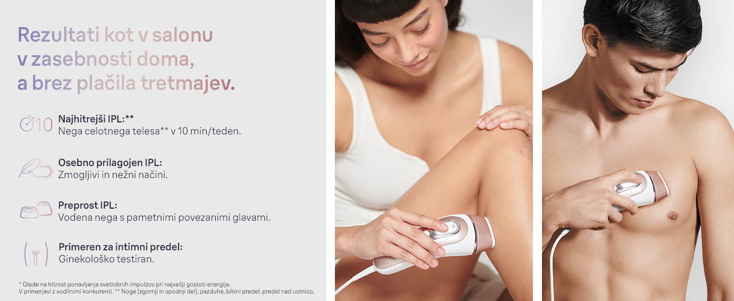 Najhitrejši in najmočnejši IPL: popoln tretma celega telesa v samo 10 minutah. Udobno in neboleče odstranjevanje dlačic z nog, rok, prsnega koša, hrbta, obraza, pazduh in celo intimnega predela s posebej prilagojenimi glavami.