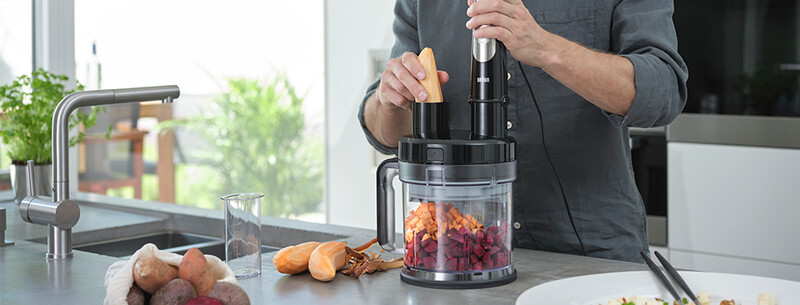 Prvi na svetu ActiveBlade premika gor in dol in meša tudi najtrša živila. 2,5 -krat bolj aktivno območje rezanja³. Potreben je manj napora⁴.