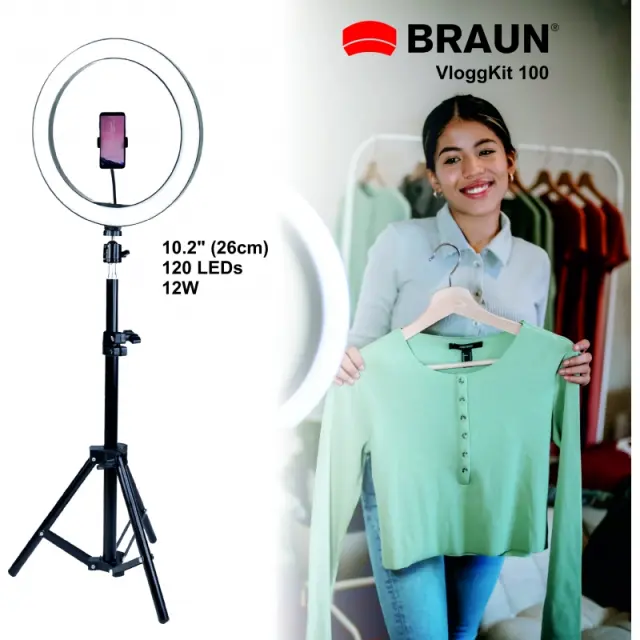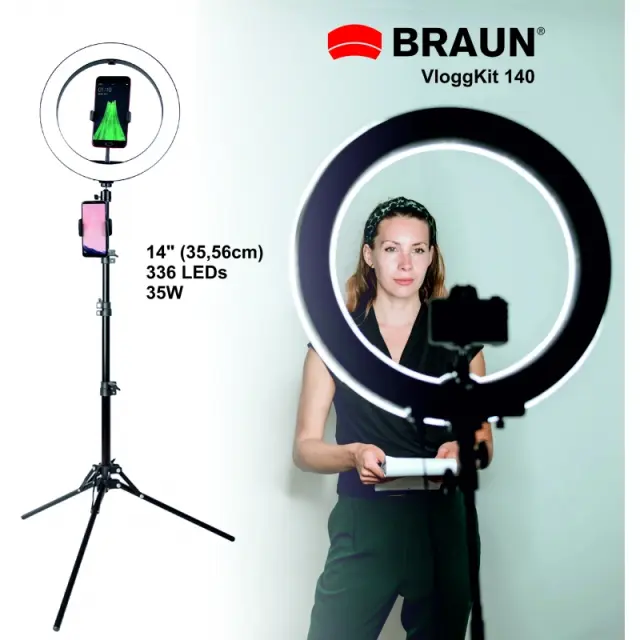Za vse vlogerje in tiste, ki to želite postati! Ta popolni začetni komplet BRAUN VloggKit 100 je primeren za skoraj vsako uporabo, zahvaljujoč zaobljenemu difuzorju in mehki osvetlitvi pa je idealen kot namizna rešitev za snemanje od blizu ali v kombinaciji z napajalnikom kot mobilni vir svetlobe. Preprosta in priročna rešitev za domače pisarne, lepotne blogerje in druge situacije, ki zahtevajo osvetlitev obraza.