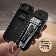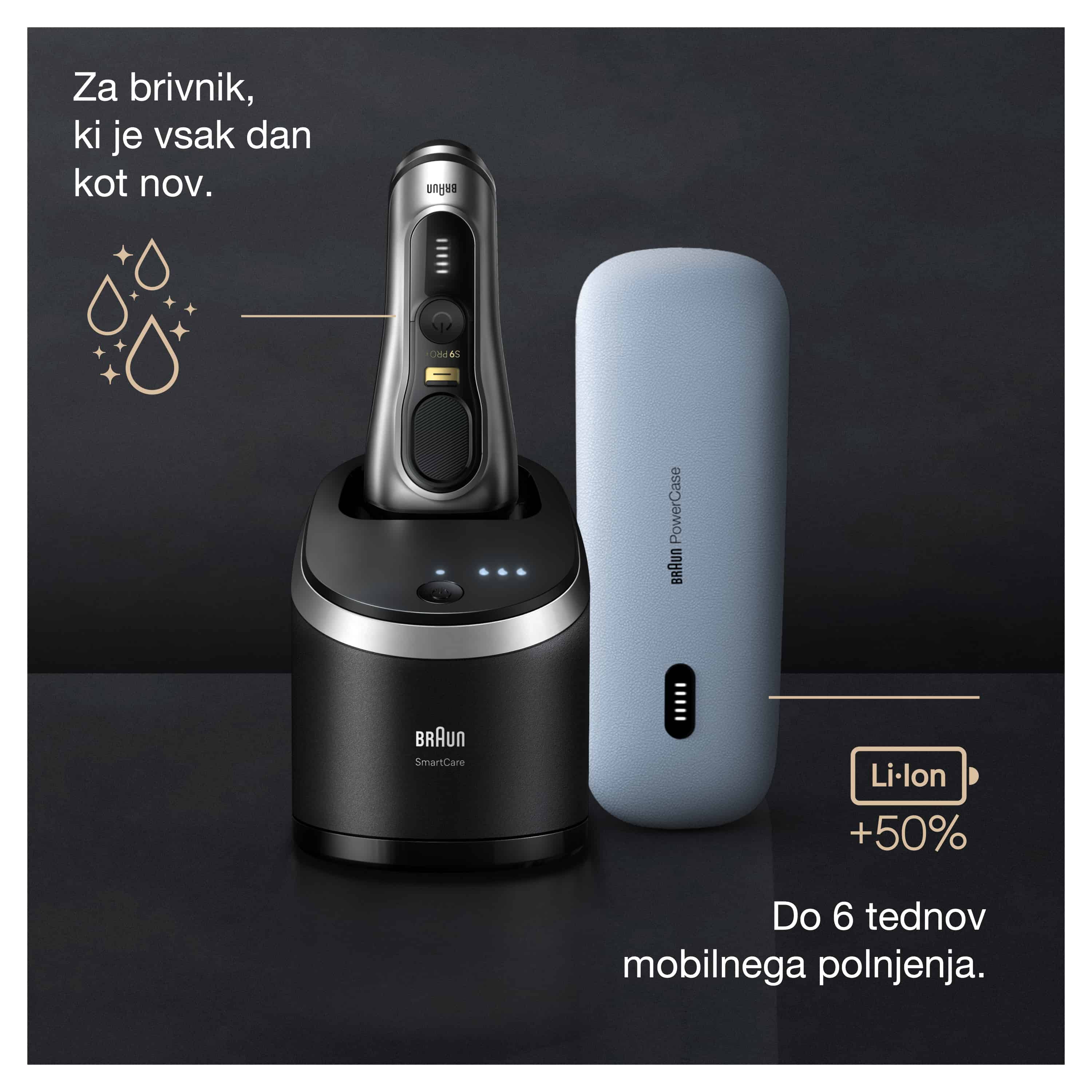 Priskrbite si električni brivnik Series 9 PRO+, ki postavlja nova merila v britju z izjemno temeljitostjo, udobjem na koži in natančnostjo ter postavlja cilj – brez večerne brade. Pet ultratankih elementov ProShave, vključno z rezilom ProBlade, zagotavlja zelo temeljito (0,05 mm) in nežno britje. Izjemno prilagodljiva brivna glava pomaga do popolnega britja, celo pod brado in nosom. Skrajno natančen po zaslugi prirezovalnika ProTrimmer, izdelanega iz nerjavečega jekla kirurške kakovosti, ki natančno odreže težavne dlake – celo puhaste dlačice/brke in zalizce. Z dvema vrhunskima dodatkoma za vsakdanjo uporabo: enoto SmartCare 6 v 1 za brivnik, ki je vsak dan kot nov, in etuijem PowerCase za do 60 minut mobilnega britja. V celoti izdelan v Nemčiji. 100-odstotno vodoodporen. Zmogljiva Li-ion baterija. Za mokro ali suho britje.