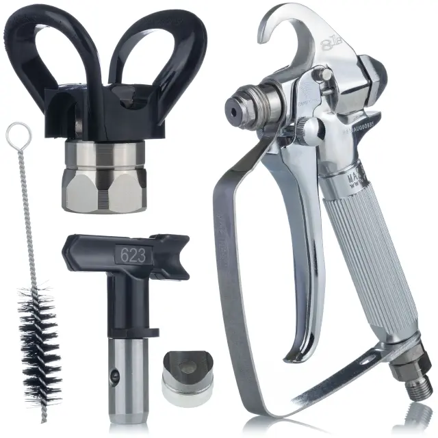 ✅ Šoba 623: Priložena šoba 623 omogoča enakomerno in gladko obdelavo površine. Zaradi optimalne velikosti šobe je primerna tako za manjše podrobnosti kot za večje površine, saj zagotavlja odlično pokritost.