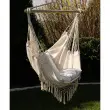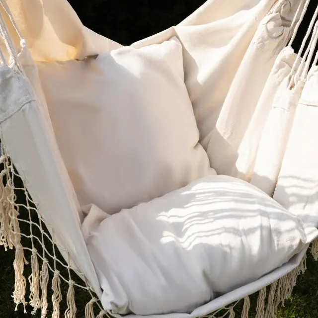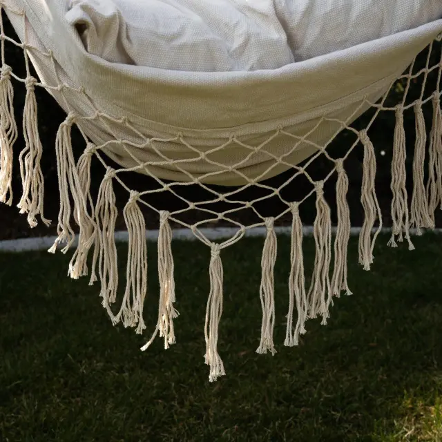 TRPEŽEN MATERIAL – bombaž zagotavlja pravilno zračenje, kar poveča udobje uporabe visečega stola tudi v vročih dneh . Za vzdržljivost sedeža skrbi primes poliestra. Trden montažni obroč je povezan s trpežnimi vrvmi, enakomerno razporejenimi na straneh viseče mreže skozi leseno prečko. Ta oblika omogoča enostavno obešanje , viseča mreža pa je dobro uravnotežena in stabilna.