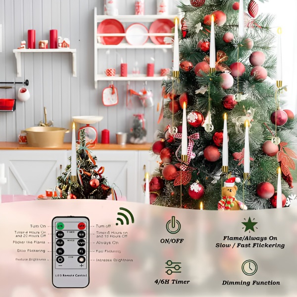Z 10-gumbnim daljinskim upravljalnikom lahko prilagodite svetlost sveč, izberete med štirimi načini svetlobe in nastavite 4- ali 6-urne časovnike za enostavno in prilagodljivo okraševanje.