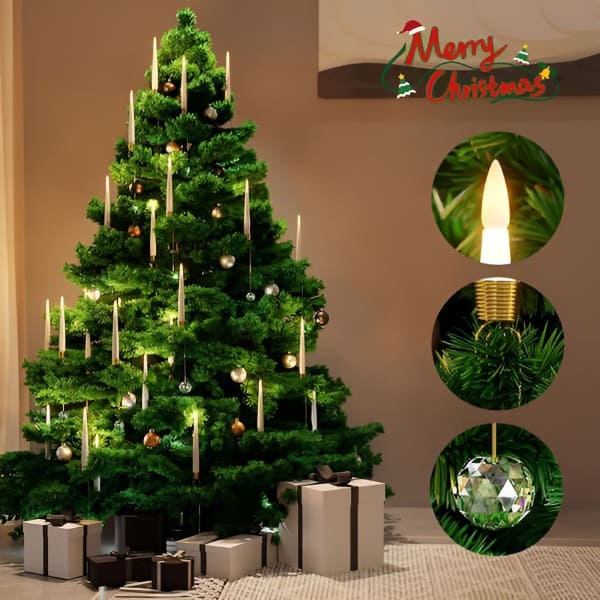 Te božične sveče za drevesce imajo zlate kavlje in prozorne kristalne krogle, ki se naravno zlijejo z vejami in ustvarijo eleganten, prazničen videz.