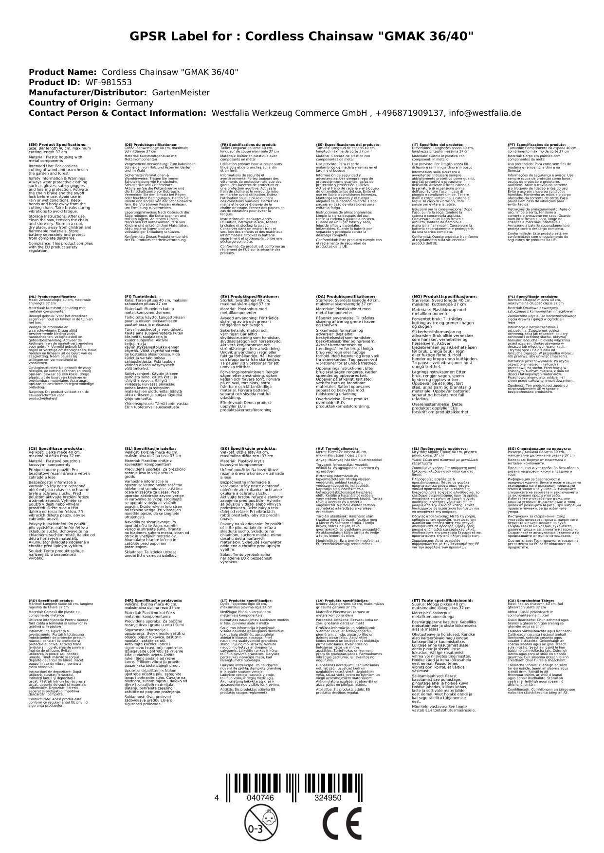 Doživite svobodo brezžičnega sekanja z Akku-Kettensäge GMAK 36/40! Ta zmogljiva verižna žaga je opremljena z 36 V motorjem, ki zagotavlja potrebno moč za zahtevna sekalna dela. Z dolžino meča 40 cm je GMAK 36/40 idealna za uporabo v vrtu in gozdu. Iz družine Westfalia 18 Volt Li-Ion Akku, teža 3800 g.