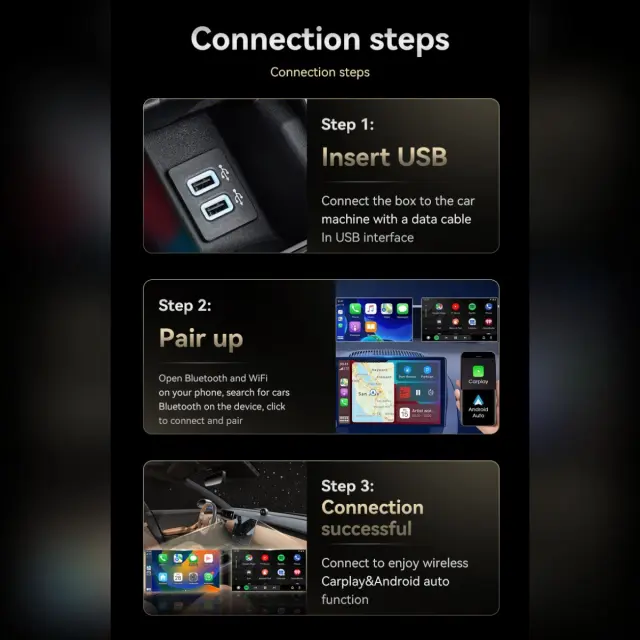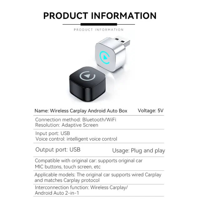 Enostavna brezžična povezljivost: Uživajte v brezhibni integraciji z informacijsko-razvedrilnim sistemom vašega avtomobila s tem 2-v-1 brezžičnim adapterjem CarPlay in Android Auto. Poslovite se od zapletenih žic in uživajte v poenostavljeni, brezžični povezavi za CarPlay in Android Auto. Ta adapter je zasnovan za optimalno združljivost s široko paleto vozil, ki že podpirajo žični CarPlay, kar vam omogoča nadgradnjo na brezžično izkušnjo brez zamenjave celotnega sistema. Uživajte v prostoročnem telefoniranju, navigaciji, pretakanju glasbe in dostopu do svojih najljubših aplikacij, vse to pa se prikaže na vgrajenem zaslonu vašega avtomobila, kar zagotavlja varnejšo in priročnejšo izkušnjo vožnje. Enostavna namestitev plug-and-play omogoča enostavno preoblikovanje vaše vozniške izkušnje v nekaj minutah.