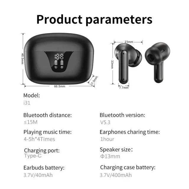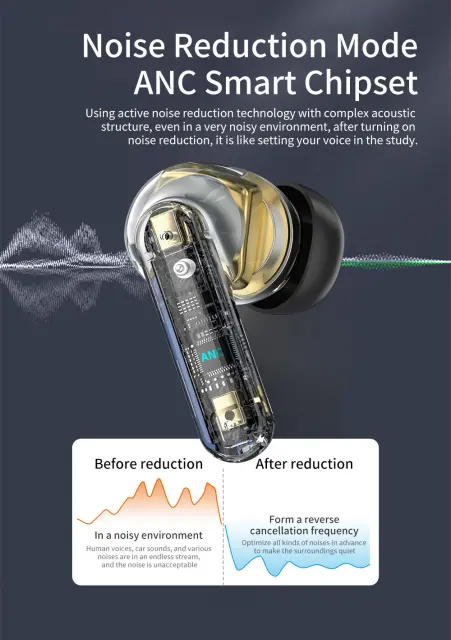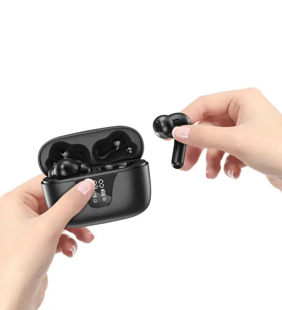 Brezžične ušesne slušalke z ergonomskimi ušesnimi nastavki, ki se udobno in trdno prilegajo ušesom – primerne tudi kot športne slušalke. Imajo dolgo življenjsko dobo baterije in polnilno ohišje z zaslonom, ki prikazuje stanje napolnjenosti. Slušalke imajo pametno upravljanje na dotik in Bluetooth 5.3, ki zagotavlja stabilen prenos signala. Visoka kakovost zvoka in zmanjšanje hrupa.