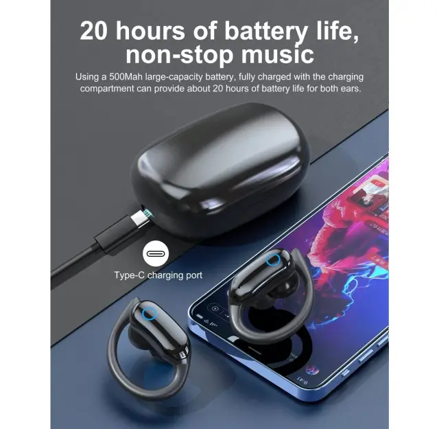 Športne slušalke z mehkimi ušesnimi kavlji, ki se udobno prilegajo in poskrbijo, da slušalk ne izgubite med zahtevnimi aktivnostmi. Z dolgo življenjsko dobo baterije in digitalnim zaslonom za stanje baterije. Polnilna torbica je praktično shranjevanje in zagotavlja dodatno zmogljivost baterije. Bluetooth 5.3 zagotavlja stabilen in kakovosten prenos signala.