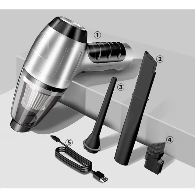 Dolgotrajna baterija: Sesalnik napaja 2000 mAh polnilna baterija, ki zagotavlja do 20 minut neprekinjenega delovanja z enim polnjenjem, kar je dovolj za čiščenje celotnega avtomobila. Priloženi kabel za polnjenje tipa C omogoča priročno polnjenje.