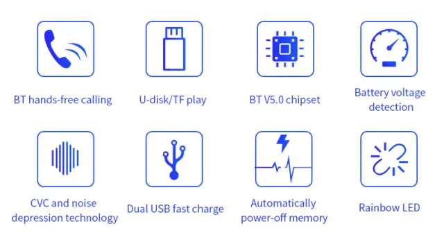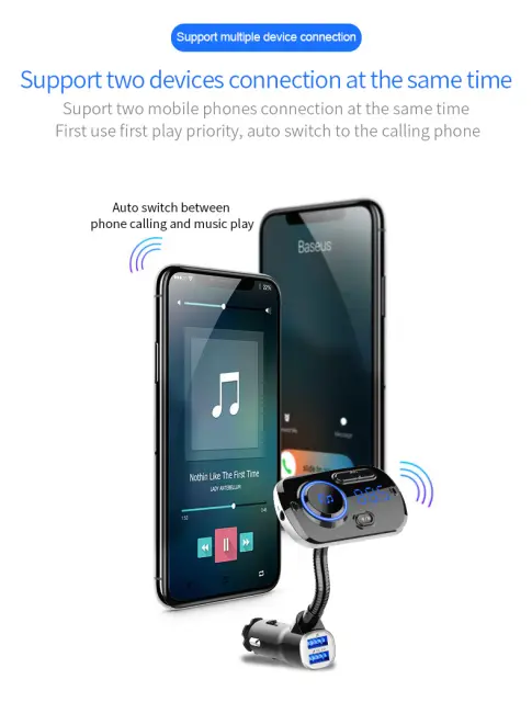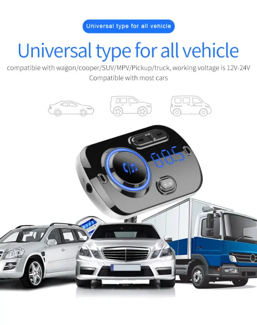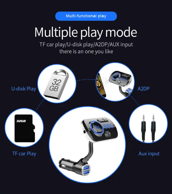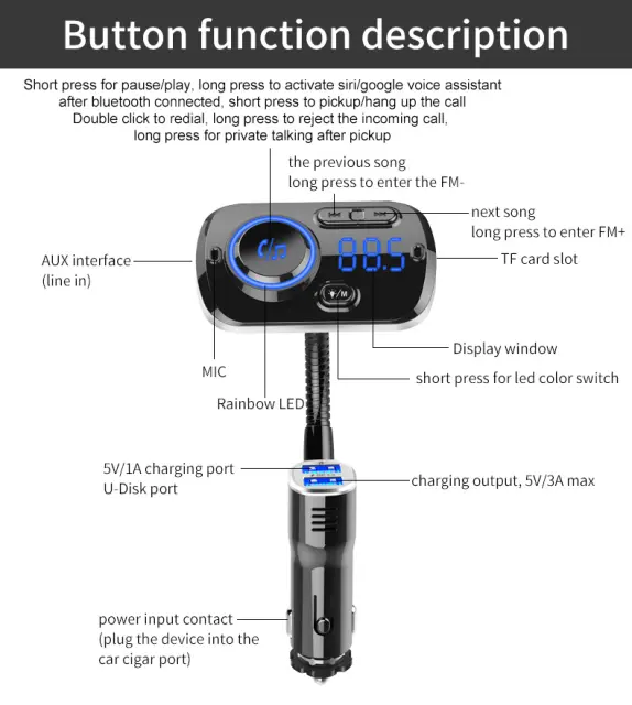 Brezžično poslušanje v avtu: Uporabite oddajnik za poslušanje glasbe v avtu prek povezave Bluetooth. Uporablja tehnologijo zmanjševanja šuma, tako da lahko poslušate lep in jasen zvok. Stabilna povezava dobro deluje tudi med telefoniranjem. Vsakič, ko je oddajnik izklopljen, si zapomni, katera FM frekvenca, katera barva in katera pesem je bila nazadnje predvajana, in tam nadaljuje, ko se znova zažene.