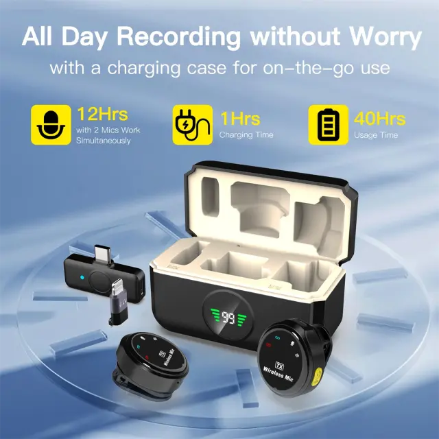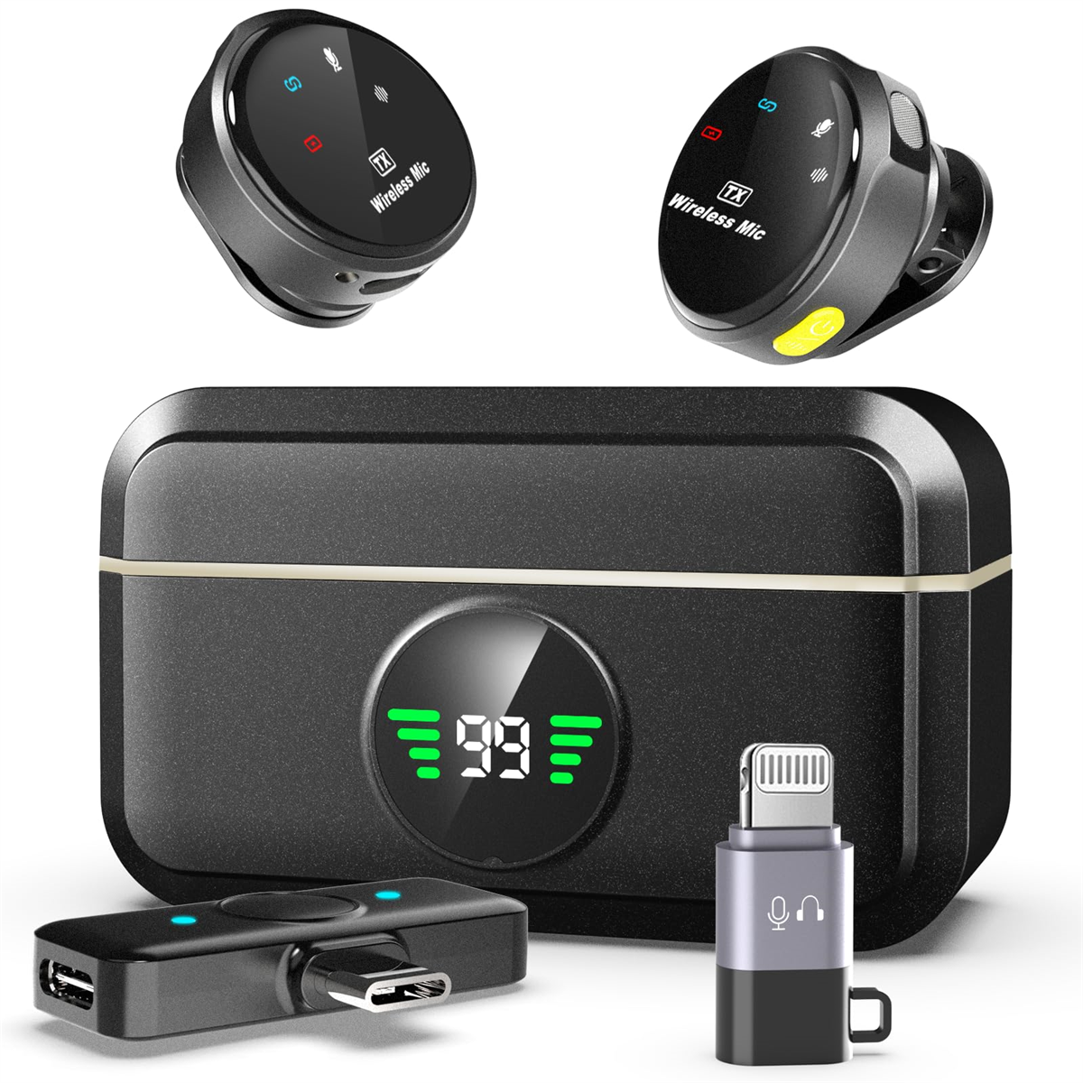 Dvojni brezžični mikrofoni – Omogočajo hkratno snemanje več glasov z dosegom do 30 metrov. Idealno za podcaste, govore ali intervjuje.